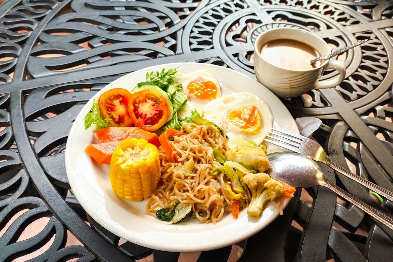 靠北的早晨凉凉的天气就是爽,清晨19度C,在庭院里享用早餐,还是一个字,爽。吃饱上街租架摩多溜达去吧!昨天用两只脚几乎走完市中心,今天要骑车去比较远点,尤其是在湄公河岸看看对面的泰国。